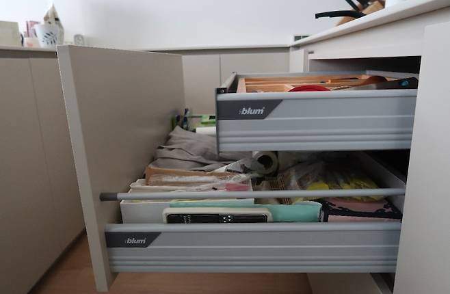 인덕션 아래쪽에는 blum사의 서랍 레일을 시공하였어요. 위 칸에는 수저, 조리도구 등을 수납하고 아래 칸에는 랩, 호일, 비닐 등을 수납하고 있어요.