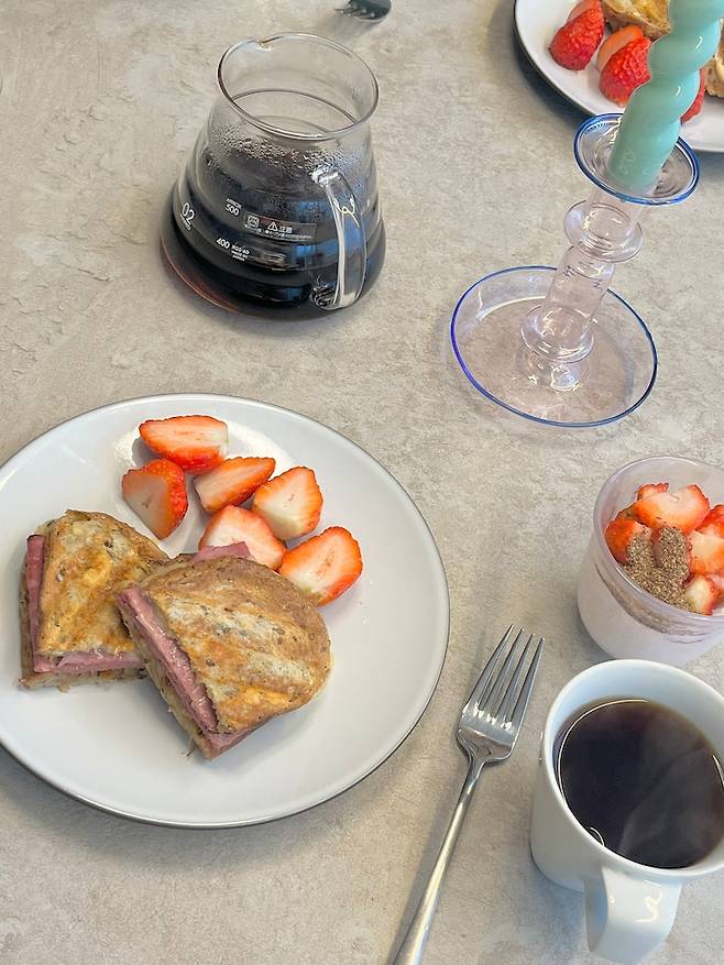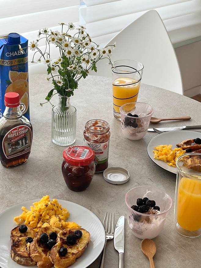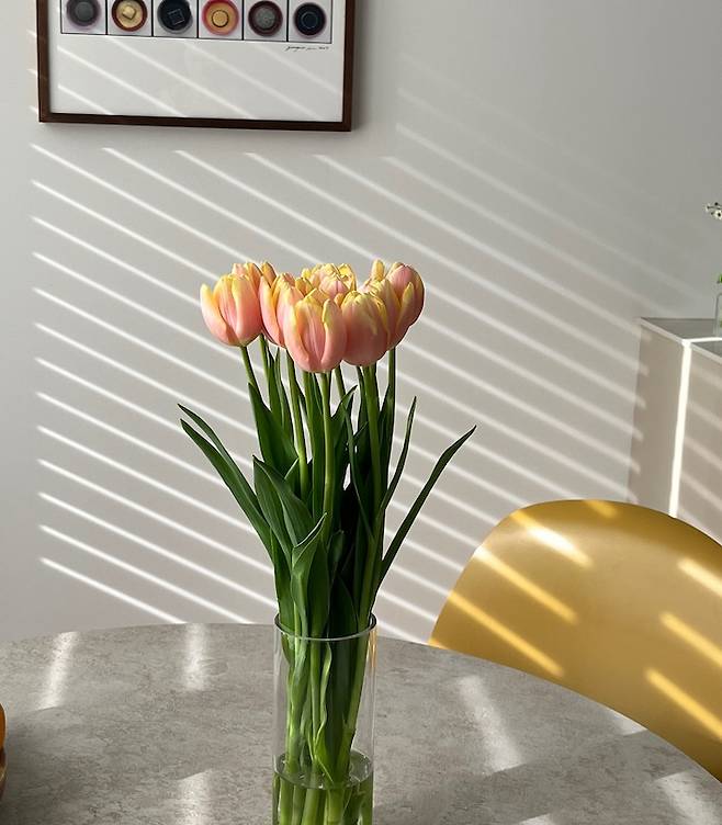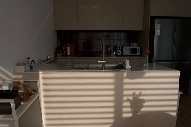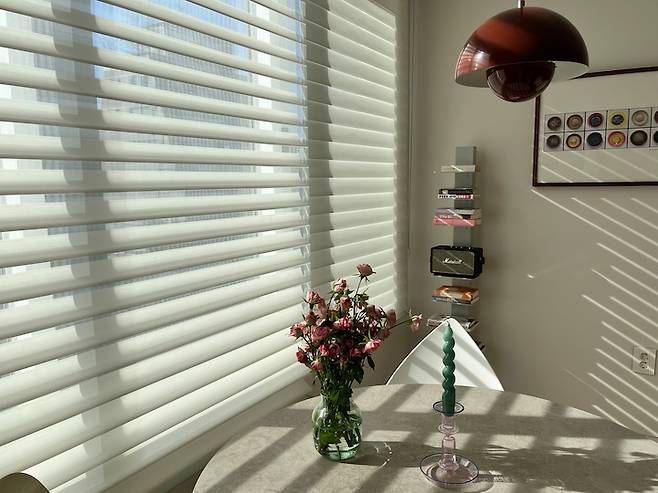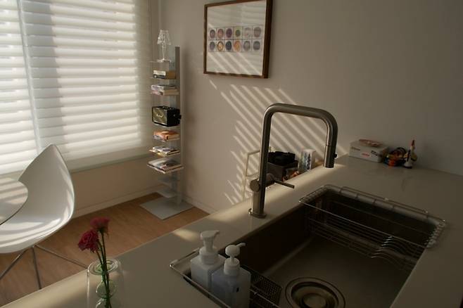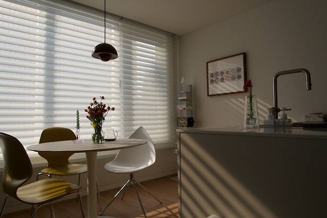 이 공간은 제가 집에서 가장 좋아하는 공간이에요 :) 주방이 남향이라 햇살도 잘 들어서 낮에 빛이 들어올 때면 너무 예뻐요. 주방은 커튼 대신 블라인드를 설치하였는데, 오전 시간대에 블라인드 사이로 햇빛이 들어와 줄무늬 그림자가 생기면 브런치 카페에 온 것 같은 느낌이 들어요! 예전에는 식탁과 TV가 가까워서, TV를 보며 식사를 하는 경우도 많았는데요, 지금은 아예 다이닝 룸에 식탁이 있다 보니 TV를 보며 먹는 것이 불가능해요. 음식과 대화에 온전히 집중할 수 있어서 좋더라구요.