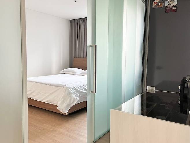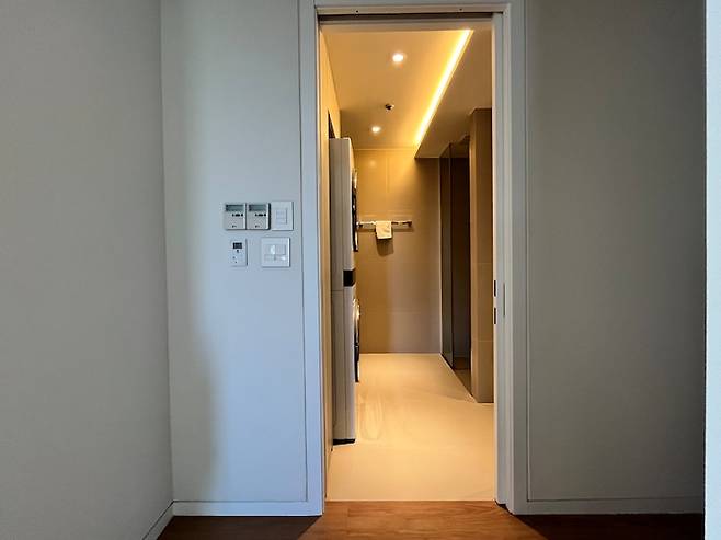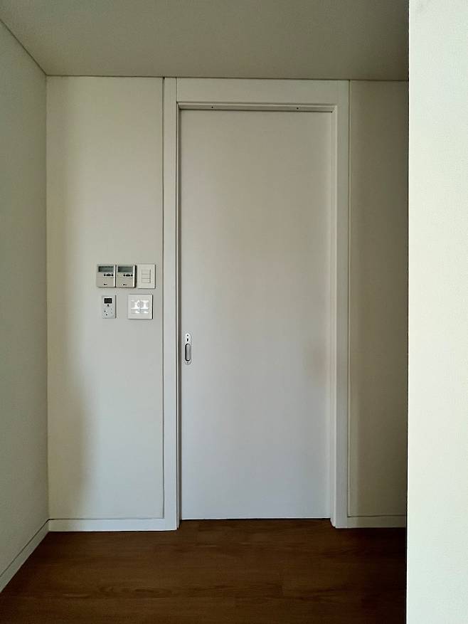 거실에서 문을 열고 들어오면 이런 모습이고, 기존에 있던 슬라이딩 도어로 침실과 드레스룸을 구분하고 있습니다.