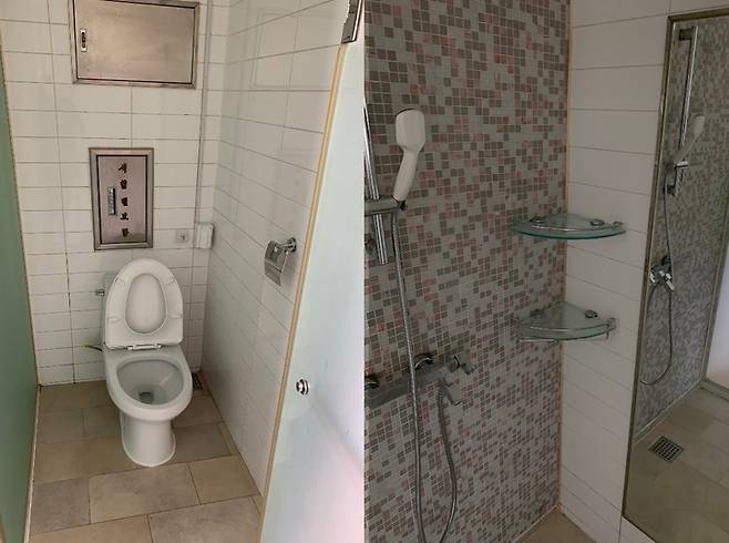 공사 전 가장 걱정이 많이 되었던 곳이 바로 화장실인데요. 사무실 같은 타일 바닥에, 푸른빛 유리 문.. 그리고 오래된 샤워실 벽타일... 변기 뒤 거대한 시험 밸브함 철문까지... 총체적 난국이었습니다 ㅎㅎ...