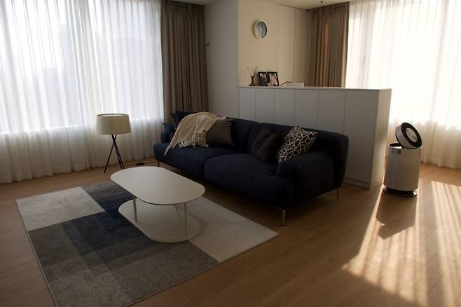 따스한 햇살이 들어오는 아늑한 거실로 변신한 모습입니다! 바닥은 메라톤의 OAK 색상을 깔았는데, 붉은 기가 빠진 매트한 오크 색상이 마음에 쏙 들어요. (작은 샘플로 봤을 때와 바닥 전체적으로 깔았을 때 느낌이 다를 수 있기 때문에 꼭 쇼룸에 가셔서 보는 것을 추천드립니다)