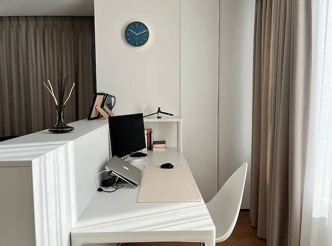 장 뒤쪽 공간은 미니 서재로 꾸며보았습니다. 재택근무할 때에는 이곳에서 업무도 보고요. 아늑한 홈오피스가 되었어요!