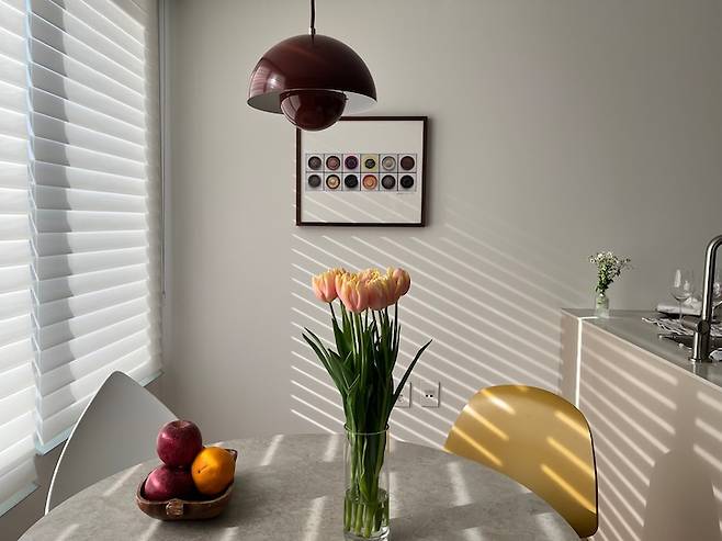 지름이 1미터라, 평소에 저희 부부 둘이 사용할 때는 사이즈가 딱 좋은데, 손님이 오셨을 때 5명 이상은 앉기 힘들더라구요. 의자도 모두 보컨셉 제품이고, 흰색 의자는 앉는 부분이 곡선으로 되어 있어서 앉으면 정말 편해요. 식탁 위에는 엔트레디션의 플라워팟 조명을 설치하였습니다. 브라운 타일과 색상을 맞춰 와인색으로 셀렉했는데 정말 잘 어울리죠?