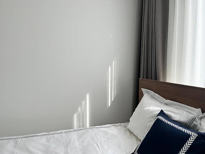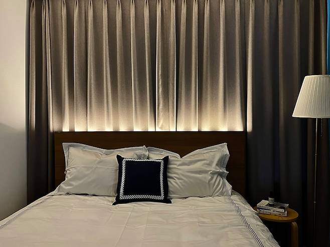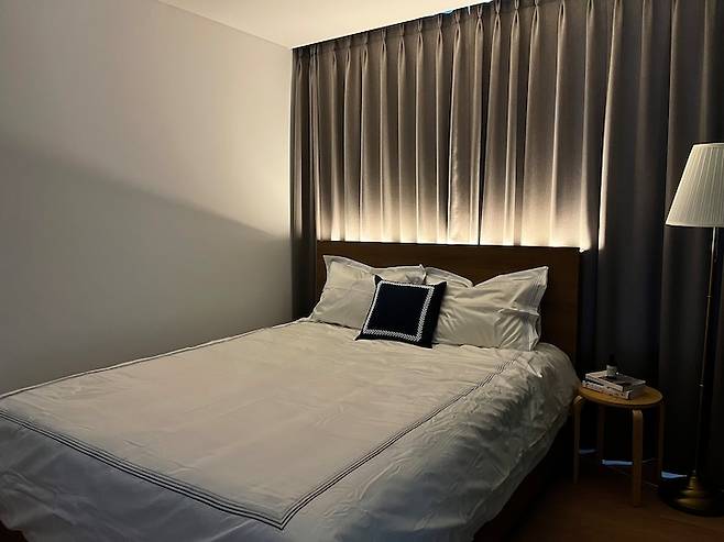 여름에는 린넨 소재의 침구로 바꿔줘요. :) 침대 헤드 쪽에 조명이 들어와서 별도로 간접조명은 필요 없지만 그래도 한 쪽에 스탠드를 두었습니다. 침대 옆 공간에 사이트 테이블을 하나 들여놓을까 고민하고 있어요. 마음에 드는 사이드 테이블을 찾기 위해 요즘 열심히 검색하고 있습니다 ㅎㅎㅎ