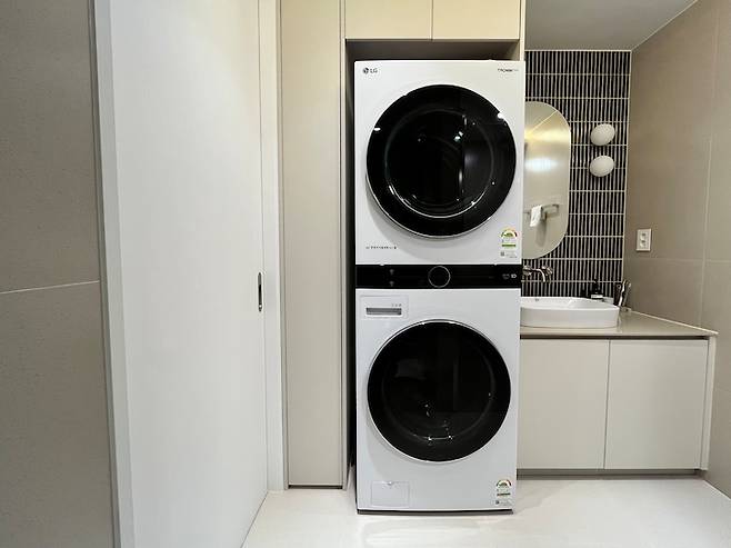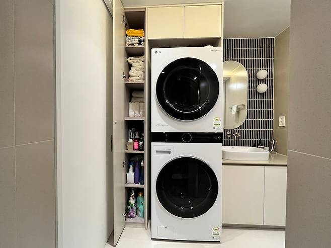 변기/샤워부스 반대쪽 모습입니다. 세면대 옆에 워시타워를 설치하였어요. 워시타워 위쪽 공간과 옆에는 수납장을 만들어 수건, 각종 세탁 용품 등을 보관하고 있어요.