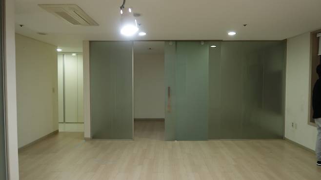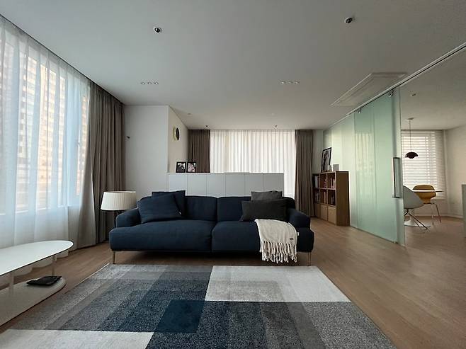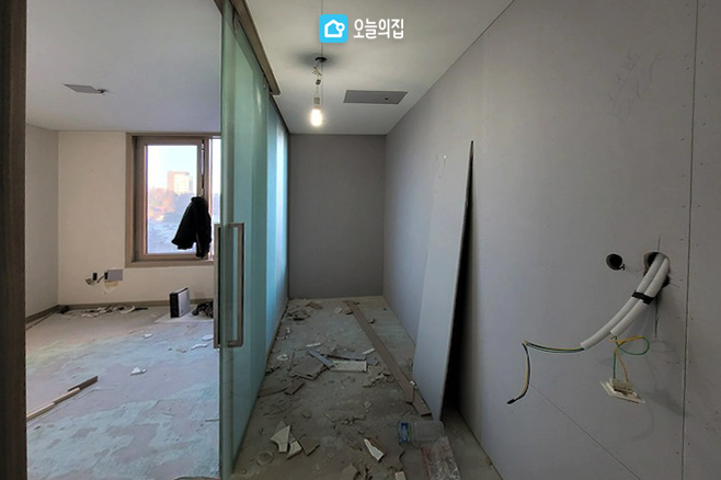 제 눈에 가장 거슬렸던 것은 거실과 방을 분리하는 바로 이 유리도어였는데요, 푸른빛의 유리도어가 공간을 차가워 보이게 하고 사무실처럼 보이게 한다고 생각해서 처음에는 철거하고 싶었어요. 하지만 철거하면 비용이 꽤나 올라간다는 치명적인 단점이 있었죠. 적절한 조명을 사용하고 벽지, 바닥을 새로 하면 유리도어도 나쁘지 않을 것 같다는 인테리어 사장님의 말을 듣고 유리도어는 유지하기로 결정했어요.