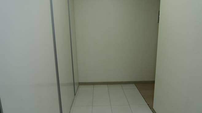 현관은 꽤 큰 편이었어요. 깔끔하게 유지되었지만, 바닥 타일이 부분 깨진 곳이 있었고, 왼쪽의 신발장 도어가 하이글로시 소재여서 살짝 올드해 보이는 느낌이 있었어요.
