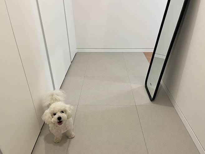 현관문을 열고 들어오면 캘리가 항상 반겨줘요 ㅎㅎㅎ 이제 막 한 살이 된 캘리는 사람을 너무 좋아해서 손님이 오면 제일 먼저 반겨준답니다! 왼쪽 신발장은 유지하였지만, 도어 필름지와 손잡이는 새것으로 깔끔하게 교체하였습니다. 신발장이 꽤 큰 편(2.5미터 정도)이라 신발 말고도 잘 안 입는 계절 옷을 수납합니다!