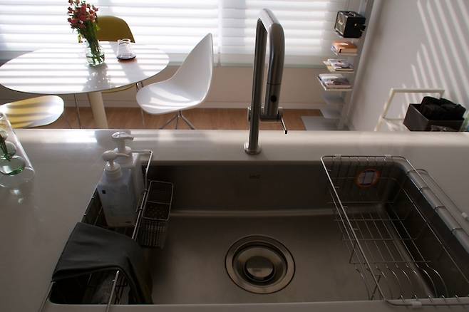 아일랜드에 싱크대를 설치하면 설거지할 때 물이 많이 튀진 않을까 걱정했는데요, 너무 세게 물을 틀지만 않으면 괜찮더라고요 ㅎㅎ 백조 콰이어트 싱크를 골랐는데, 물소리가 크지 않고, 모서리 부분이 둥글게 처리되어 있어 물때가 잘 끼지 않아서 너무 만족합니다.