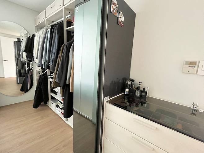 침실 앞쪽 공간에 가벽을 세워 만든 작은 드레스룸입니다. 이곳에는 자주 입는 옷들과 서랍장, 스타일러를 놓고 사용해요.