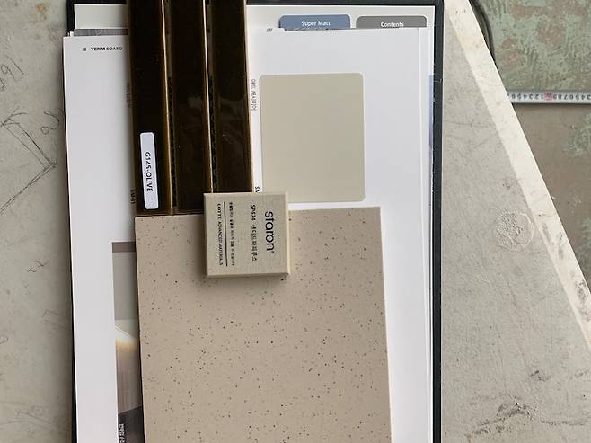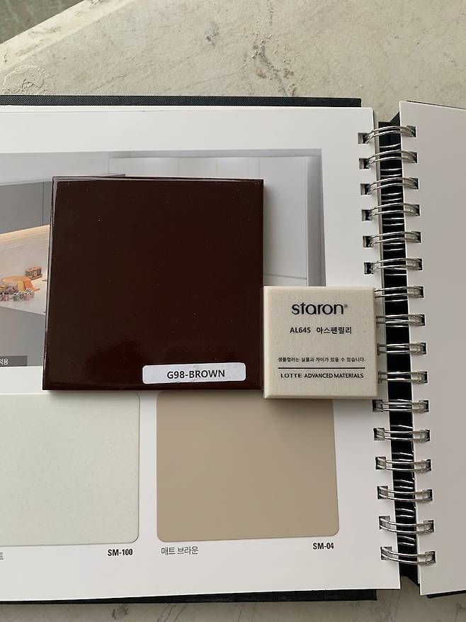 주방 상판은 롯데 스타론의 아스펜릴리 색상이고, 몸통/도어는 예림의 매트 브라운 색상입니다. 주방 벽 쪽에 유광 타일로 포인트를 주고 싶었는데, 인테리어 사장님께서 추천해 주신 브라운 색상이 너무 하고 싶어서, 상판과 도어 색상을 타일 색상에 맞춰 골랐어요.