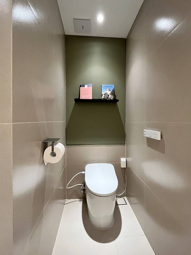 변기 뒤쪽의 시험밸브관 철문이 있던 곳은 도장을 칠한 합판을 덧대어 가려 두었는데요, 필요시에는 열 수 있도록 못질은 하지 않았고, 강력한 자석으로 고정을 해두었어요. 정말 감쪽같죠? ㅎㅎ 손잡이 겸 장식용으로 달아놓은 선반에는 예쁜 잡지 등을 올려 두어 벽이 너무 밋밋해 보이지 않게 해주고 있어요.