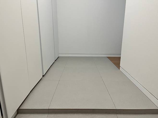 현관문을 열고 들어오면 이런 느낌이에요. 현관부터 복도 끝까지 동일한 타일을 사용해서 통일감을 주었고, 600각 타일이어서 조금 더 공간이 넓어 보여요. 또한 기존의 우드 색상 걸레받이는 전부 화이트 우드 패턴의 필름지로 교체하였습니다. 타일은 연한 그레이 무광 타일을 사용하였는데요, 모던한 느낌을 주는 색상이나 재질은 정말 마음에 들지만, 아무래도 무광이다 보니... 신발로 인해 쉽게 더러워지기도 하고 청소하기가 조금 불편하더라고요. ㅜㅜ 다음엔 현관 타일은 무조건 유광으로 골라야겠어요. ㅎㅎ