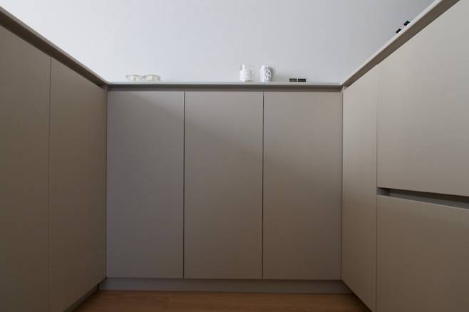 20평형대 집에서 이렇게 넓은 주방을 갖게 될 거라곤 상상도 못했어요. 원래는 11자형 주방으로 시공하려고 했는데, 수도를 벽 반대편에서 끌어오느라 'ㄷ'자 주방으로 시공하였고, 벽 부분은 수도를 가릴 정도의 두께로만 수납 장을 짜서 공간이 좁아 보이지 않게 했어요.