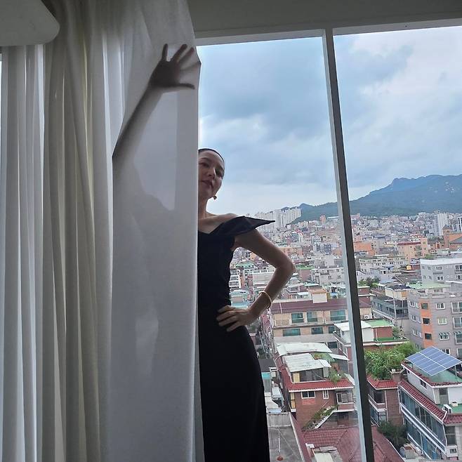 드레스 라인은 몸에 과도하게 밀착하지 않고 자연스럽게 떨어지면서도 허리선을 은근하게 강조해 우아한 곡선을 드러낸다. 이는 그녀의 자기 관리가 만들어낸 단단한 실루엣을 보여주는 부분으로, 나이를 초월한 성숙미와 프로페셔널한 매력이 돋보인다. 커튼을 젖히며 드러낸 제스처는 여유로운 자신감까지 담아내며, ‘동안’이란 수식어 대신 오히려 ‘시간이 쌓여 완성된 고혹미’라는 표현이 어울린다.
