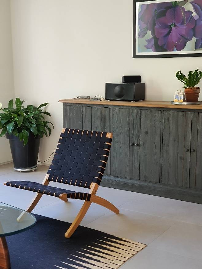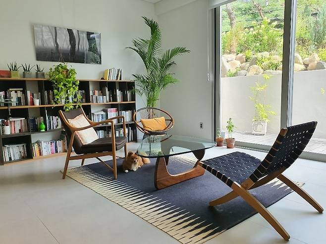 1층 거실은 TV 없이 1인용 의자 세 개와 남편의 책들이 있는 책꽂이, 사진 작품과 프린팅 그림들로 채웠습니다. 차분하면서 편한 공간으로 책도 읽고 음악도 듣고 맥주 한 잔도 하는 그런 공간입니다.
