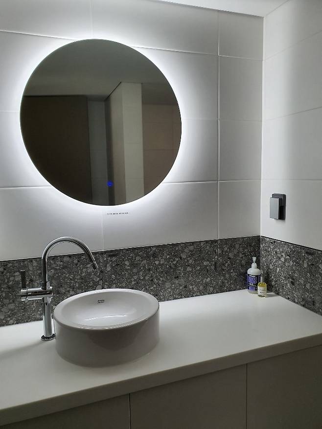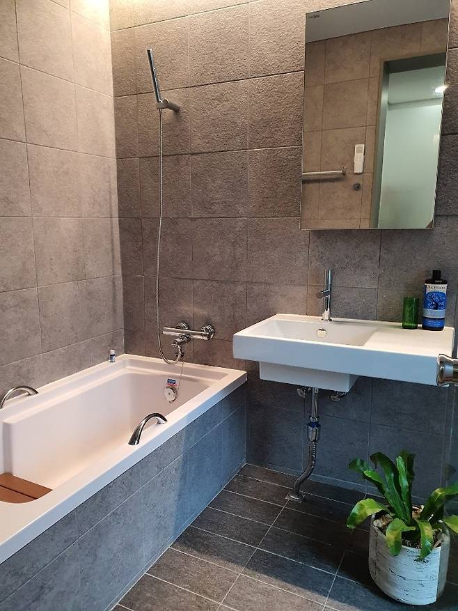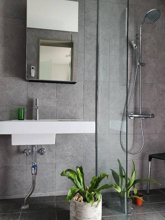 2층에도 2개의 화장실이 있습니다. 모노 톤의 깔끔한 스타일로 오랫동안 질리지 않을 디자인으로 연출하려고 했습니다. 위 두 사진은 2층 입구에 있는 메인 욕실입니다.