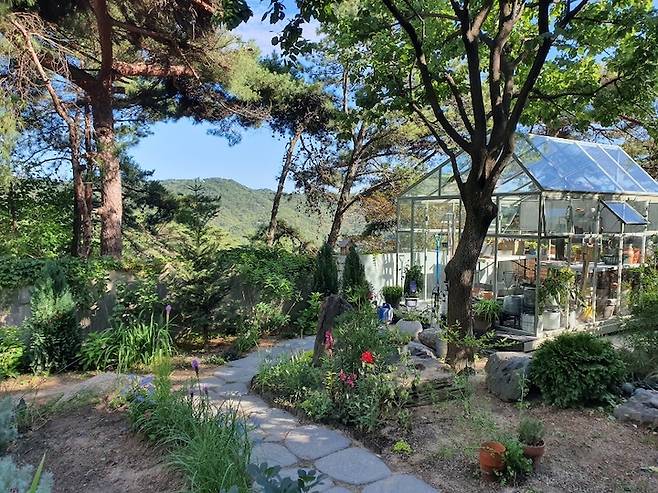 위 사진은 정원 한 쪽에 마련한 저희 집 유리온실 내부입니다. 가드닝 용품도 있고 겨울에 추위에 약한 식물들을 옮겨놓기도 하고 파종을 위한 공간이기도 합니다.