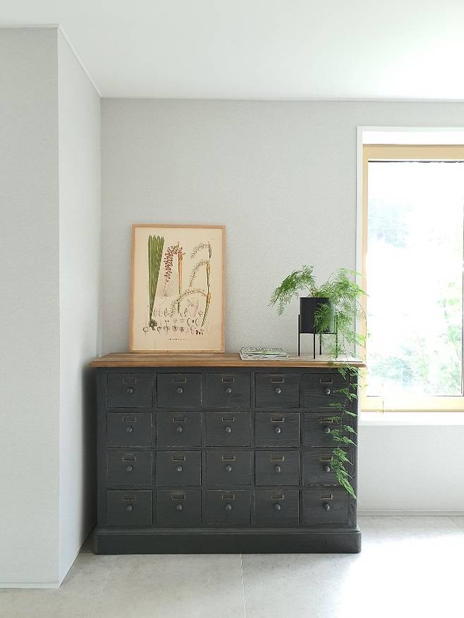 주방에서 서재로 가는 길지 않은 복도에 서랍장과 세밀화 포스터, 식물 화분을 놓았습니다.
