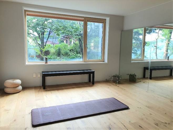 그리고 2층에는 저의 최애 공간인 요가&명상실을 만들었습니다. 안쪽으로는 정원 뷰가 있고, 반대편은 북한산 뷰가 있습니다. 최소의 가구만 놓아 마루 바닥재에 신경 썼고요. 한 벽면은 거울로 마감했습니다.