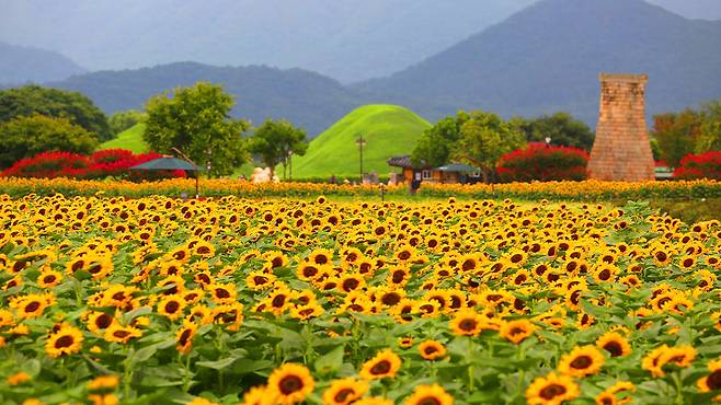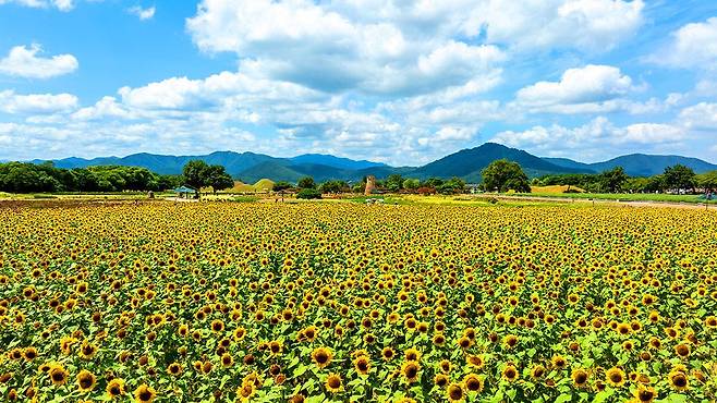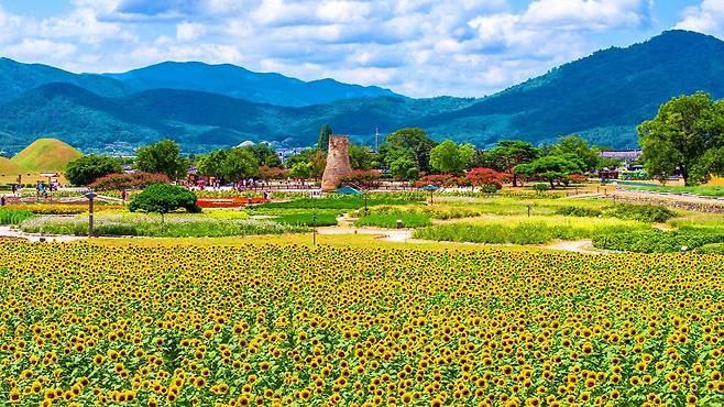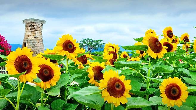 한여름의 끝자락, 무더위가 여전한 8월 초. 경주 동부사적지대 첨성대 주변은 노란 해바라기가 만개하며 신라의 역사와 계절의 정취가 어우러진 특별한 풍경을 선사한다.