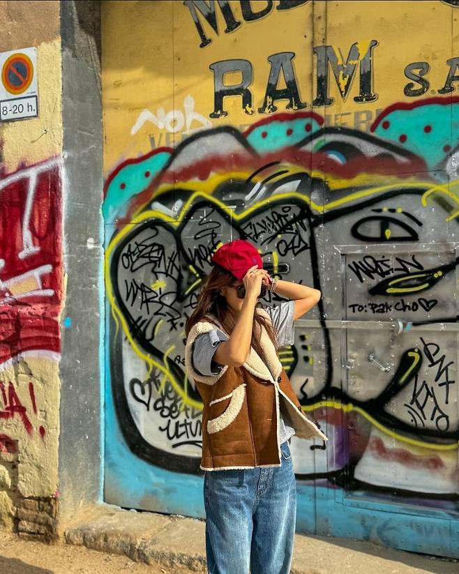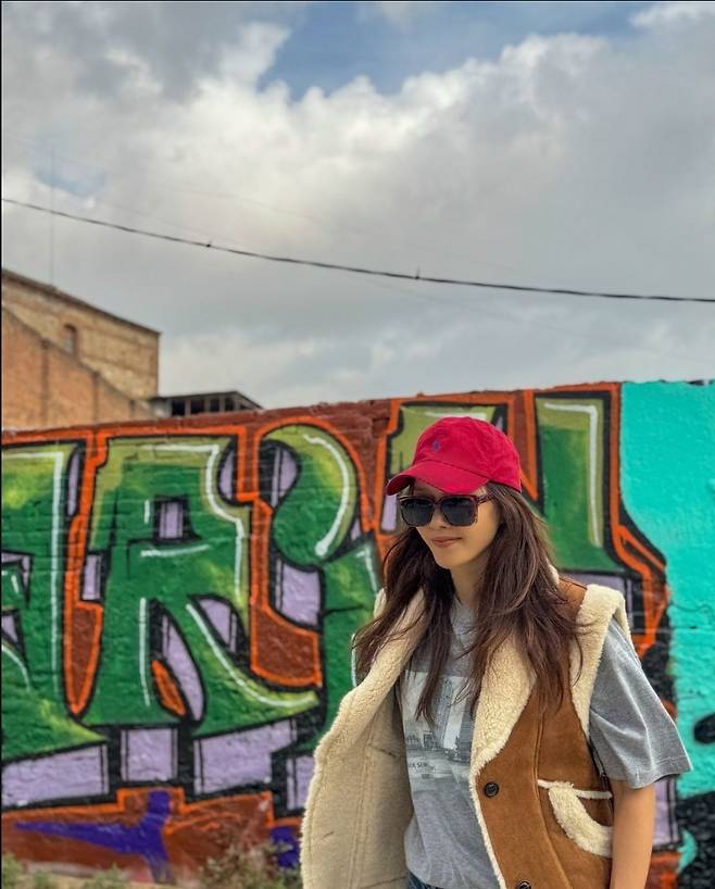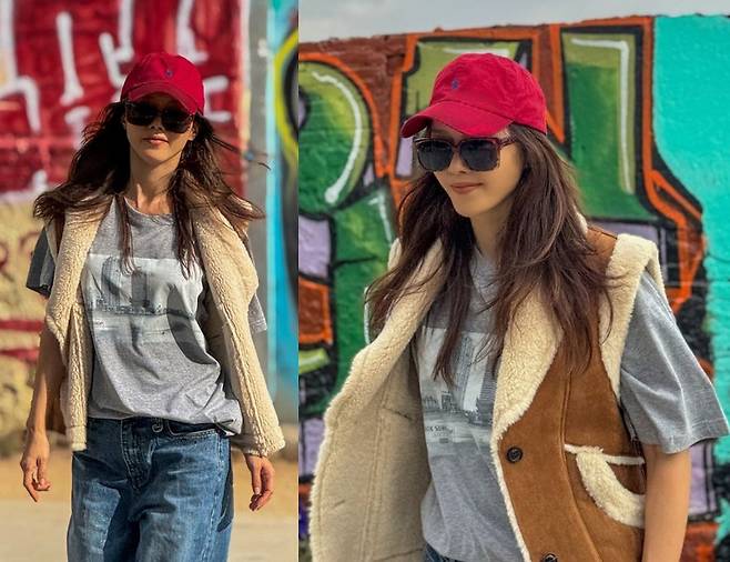 채정안은 스트리트 아트와 어우러진 그레이 컬러의 그래픽 티셔츠에 와이드 핏 데님 팬츠를 매치하여 편안하면서도 스타일리시한 느낌을 연출했습니다.