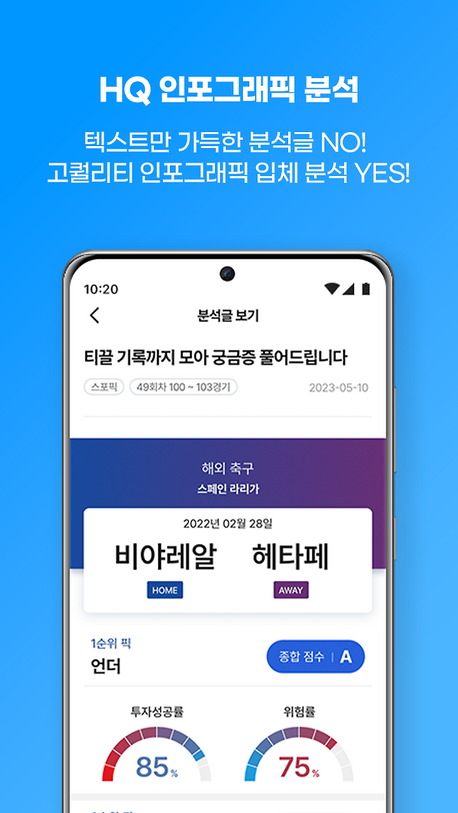 가장 큰 특징으로는 국내 스포츠토토 대상 전 경기에 인포그래픽 분석 서비스를 제공한다. 인포그래픽에는 투자 점수, 위험율을 산정한 종합 점수를 바탕으로 경기당 추천 픽 3개, 40개 부문의 스탯 비교를 담았다. 여기에 팀별 상세 현황과 배당 분석 컨텐츠까지 볼 수 있다.