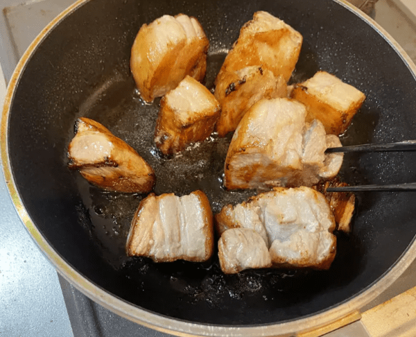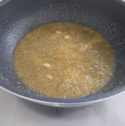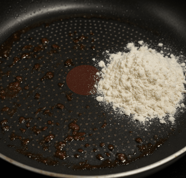 팬에 남은 기름 위에 밀가루를 넉넉히 뿌려주면 기름과 밀가루가 만나면서 서서히 덩어리 형태로 변한다. 이 상태에서 약한 불로 살짝만 가열해주면 밀가루가 기름을 더 많이 흡수하며 점점 고체화되기 시작하고, 덩어리가 생기면 주걱이나 뒤집개로 한 덩이씩 긁어내기 쉬워진다.