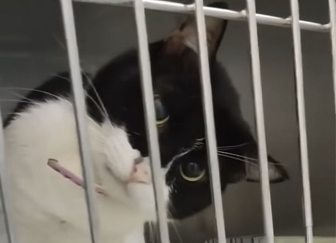 그런데 자세히 보니, 고양이는 사실 바로 앞에 있는 우리 안에 있었어요. 고개를 갸웃하며 호기심 가득한 표정으로 여성을 바라보고 있었던 거죠.
