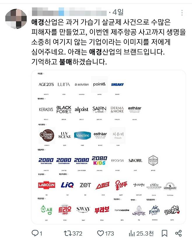 | ▲ 179명이 숨진 제주항공 참사 이후 제주항공의 모기업이 애경그룹인 점이 회자되면서 온라인 상에서 불매 운동이 벌어지고 있다. |