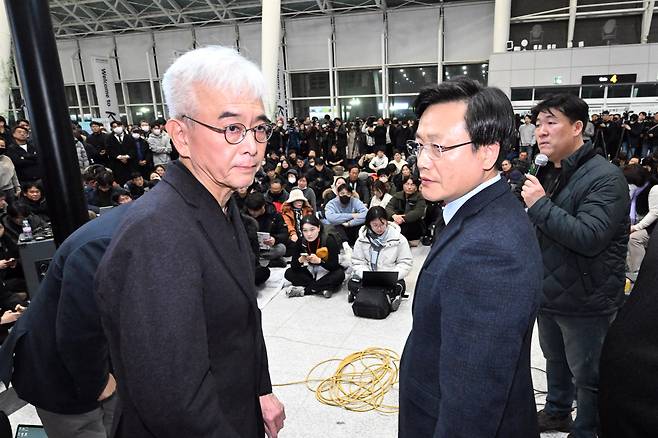 | ▲ 채형석 애경 총괄부회장(왼쪽부터)과 김이배 제주항공 대표가 2024년 12월 29일 전남 무안국제공항 2층 유가족 대기실을 방문해 179명이 숨진 제주항공 여객기 참사에 대해 사과한 뒤 발걸음을 돌리고 있다. |