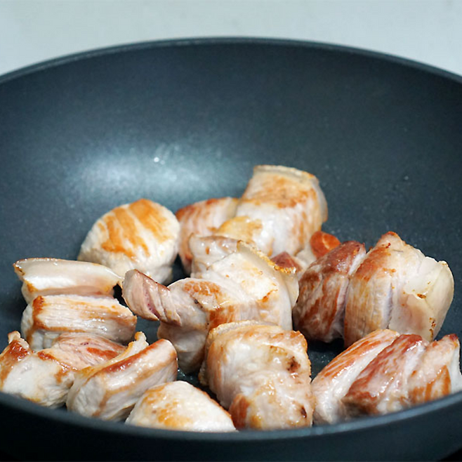 삼겹살은 깍뚝썰어서 노릇하게 구워줍니다.