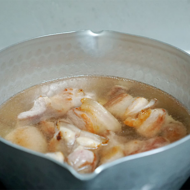 구운 삼겹살 기름은 닦아내고 냄비에 물을 붓고 약 10분정도 바글바글 끓여줍니다.