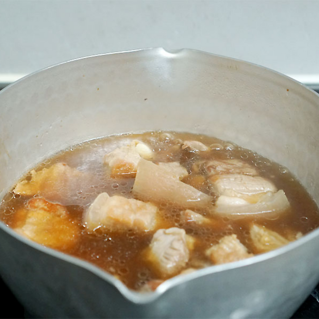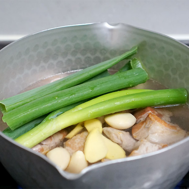 끓인 삼겹살은 체에 받쳐주고 냄비에 다시 고기를 넣은 후 물을 자작하게 부어줍니다.대파와 생강, 마늘, 식초, 청주 넣고 뚜껑이 있으면 덮고 끓여줍니다.