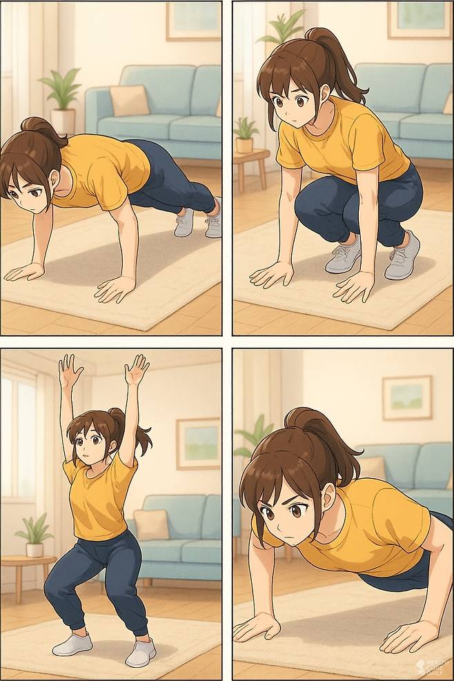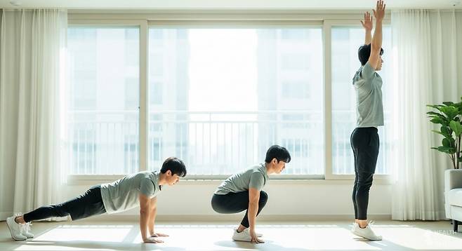 무릎이 약하거나 층간소음이 걱정된다면 점프를 생략한 ‘하프 버피’를 선택하는 것도 좋은 방법이다. 이 경우 다리를 뒤로 보낼 때 한 발씩 천천히 움직이고, 다시 앞으로 가져올 때도 점프 대신 상체를 일으켜 세우는 것으로 마무리한다.