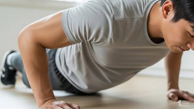 팔굽혀펴기로 잘 알려진 푸쉬업은 상체 근육 강화에 대표적인 운동이다. 가슴, 어깨, 팔은 물론 엉덩이와 복부까지 전신의 주요 근육이 함께 작용해 근력과 근지구력을 동시에 향상시킨다. 꾸준히 하면 척추를 안정적으로 지탱하는 코어 근육이 강화되어 올바른 자세 유지에도 도움이 된다.
