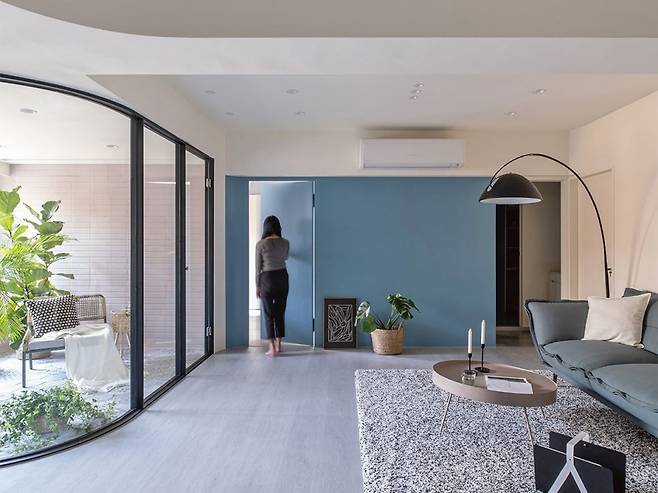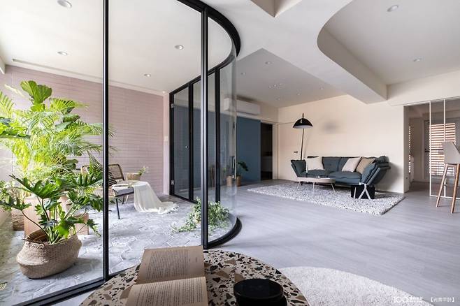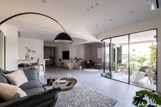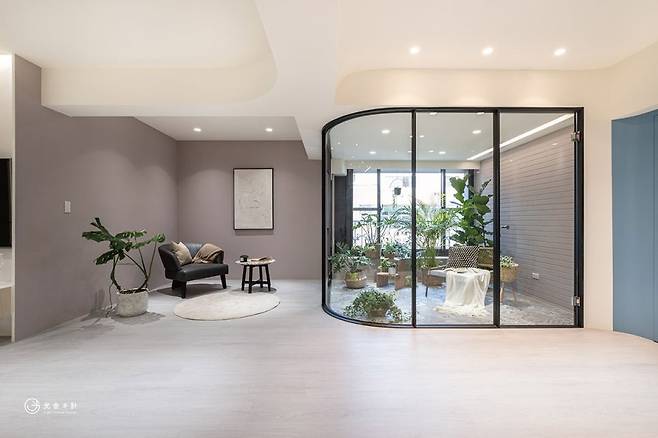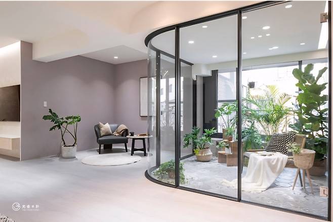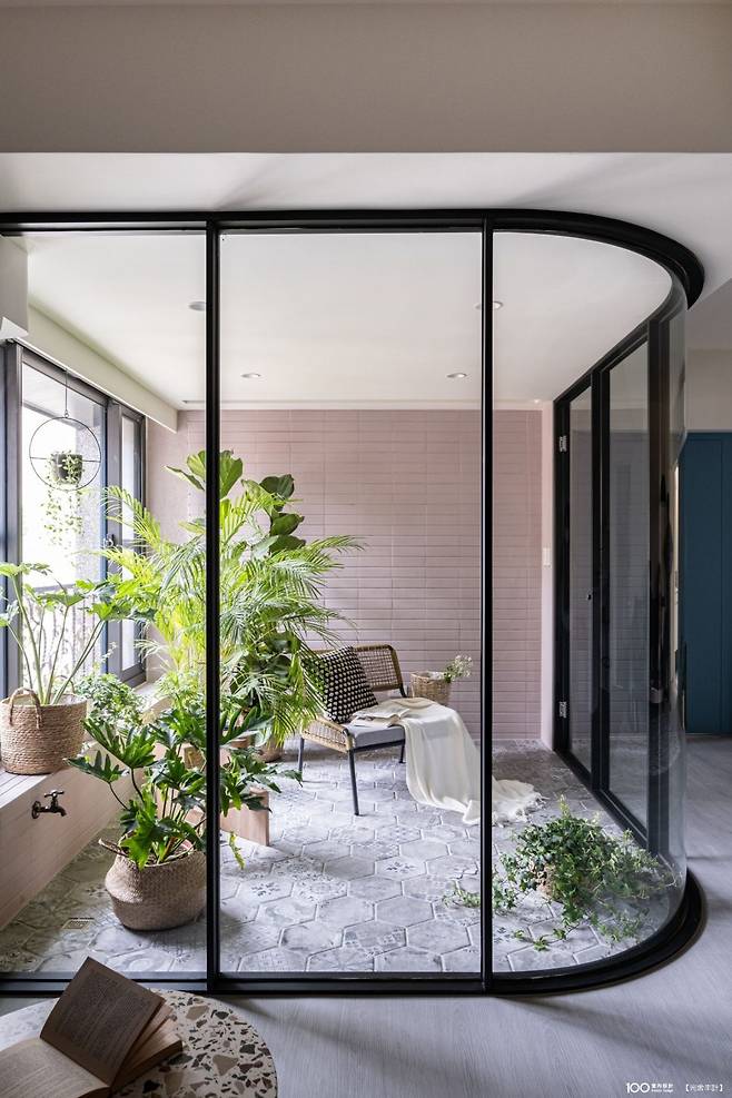 대신 그 자리에 곡선 유리 파티션으로 둘러싼 실내정원을 만들었어요. 높낮이가 다른 화분들을 배치하니 마치 작은 숲속에 앉아 있는 듯한 분위기가 완성됐죠.