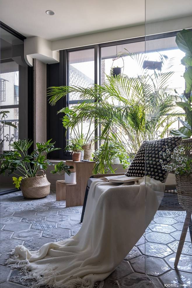 바닥에는 육각 타일을 깔아 야외 정원 같은 느낌을 더했습니다. 차갑지 않으면서도 세련된 질감이 라탄 체어, 패브릭 블랭킷과 자연스럽게 어우러지죠.