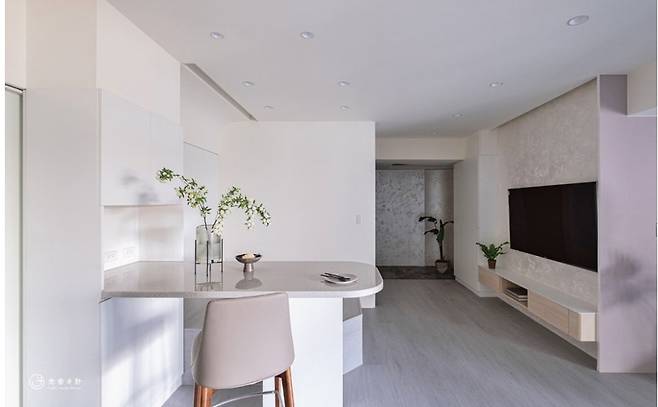 TV는 다이닝 존 벽면에 걸어뒀어요. 식사하거나 차 마시며 편하게 시청할 수 있는 구조입니다.