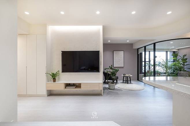 곡선 유리는 단순한 장식이 아니에요. 햇살이 들어올 때마다 빛이 부드럽게 번지며 거실 전체를 환하게 만들어줍니다.