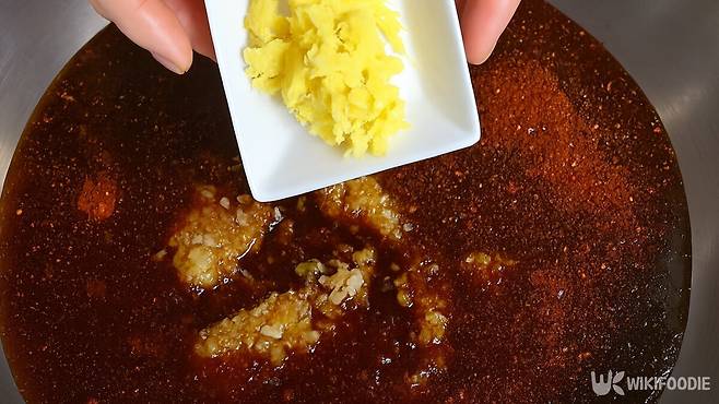 양념장은 간장 베이스로 만든다. 양조간장 300ml에 액젓 4.5티스푼을 넣는다. 고춧가루는 105g, 매실청은 90ml, 올리고당은 180g, 진하게 우린 멸치 다시마 육수는 150ml 넣는다. 여기에 다진 마늘 6티스푼, 다진 생강 1.5티스푼을 섞어 양념장을 완성한다.