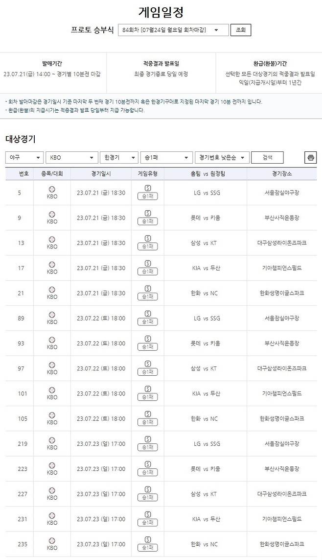 국민체육진흥공단이 발행하는 체육진흥투표권 스포츠토토의 수탁사업자 스포츠토토코리아가 오는 21일(금) 오후 2시부터 발매를 개시하는 프로토 승부식 84회차에 새롭게 런칭된 ‘야구승1패’ 게임 유형이 적용된다고 7월 20일 밝혔다.