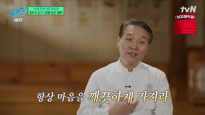 21일 방송된 tvN <유 퀴즈 온 더 블럭>에 출연한 중식대가 후덕죽 셰프가 조리사의 마음가짐을 강조했다.