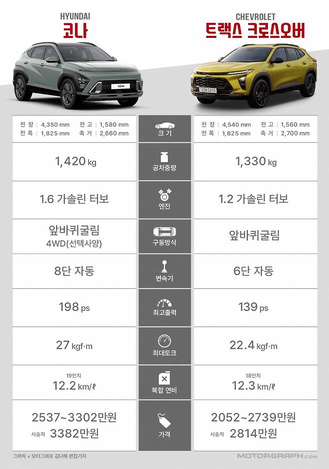 개인 취향 및 가치관에 따라 선택지가 갈리겠지만, 코나와 트랙스 모두 대다수에게 인정받을 수 있는 장점과 특징을 아주 분명하게 갖추고 있다.