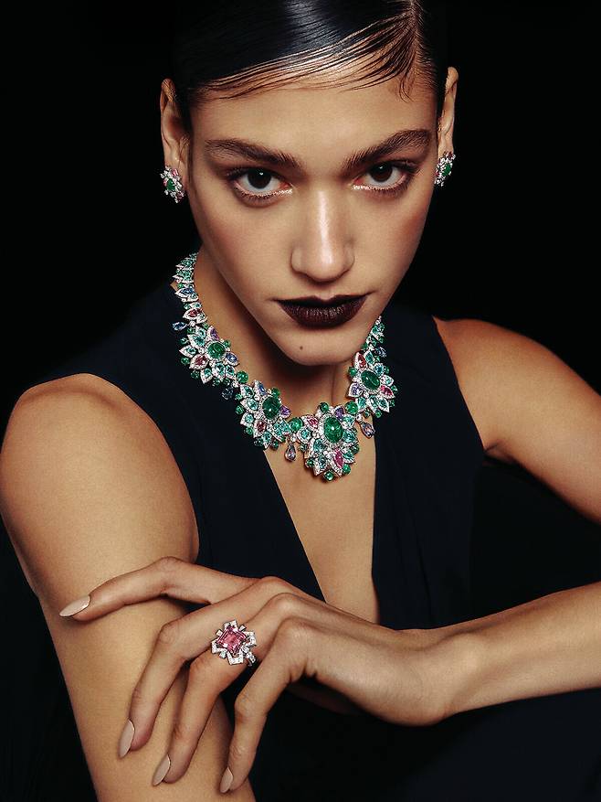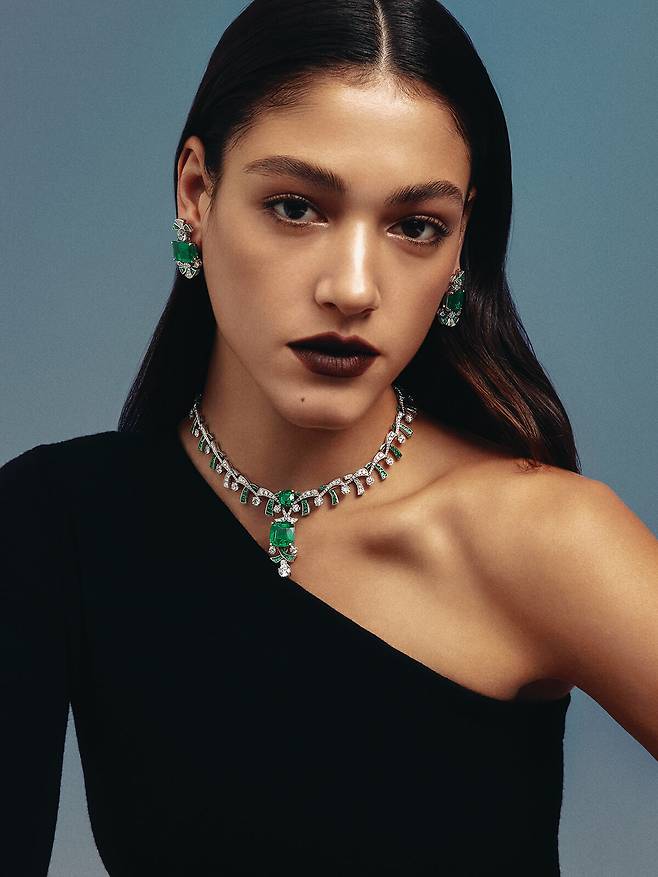 각각 1.05캐럿과 1.03캐럿의 라운드 브릴리언트 컷 다이아몬드 2개 아래로 페어 컷 에메랄드 6개(총 3.94캐럿)와 라운드 컷 에메랄드 4개(총 2.00캐럿)를 세팅했으며, 마키즈·페어·팬시·라운드 브릴리언트 등의 커팅이 극강의 빛을 발하는 다이아몬드(총 15.34캐럿)를 세팅한 이어링. 총 22.42캐럿의 잠비아산 에메랄드 5개가 묵직하게 자리한 네크리스는 라운드 컷 에메랄드 3개(총 3.48캐럿)와 라운드 브릴리언트·마키즈·페어·팬시 컷 다이아몬드 총 56.54캐럿을 세팅했다. 모두 Bulgari.
