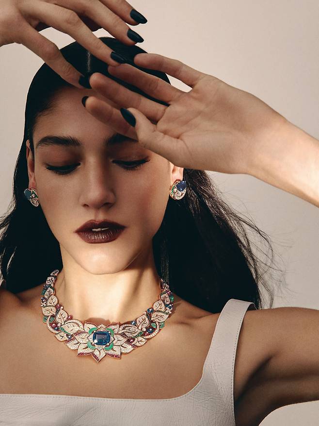 각각 9.24캐럿과 9.67캐럿의 오벌 컷 스리랑카산 사파이어와 팬시 버프 톱 컷 에메랄드 10개(총 0.70캐럿), 팬시 버프 톱 사파이어 10개(총 0.70캐럿), 다이아몬드 (총 2.23캐럿)를 세팅한 로즈 골드 이어링, 중앙에 배치한 29.14캐럿의 쿠션 컷 스리랑카산 사파이어 중심으로 크리소프레이즈와 루비 비즈 9개(총 10.27캐럿), 사파이어 비즈 10개(총 11.49캐럿), 버프 톱 컷 루비(총 6.00캐럿), 버프 톱 컷 사파이어(총 5.66캐럿), 버프 톱 컷 에메랄드(총 6.84캐럿), 팬시 컷 다이아몬드(총 1.40캐럿), 다이아몬드(총 19.26캐럿)를 세팅해 꽃잎과 이파리를 형상화한 로즈 골드 네크리스 모두 Bulgari.