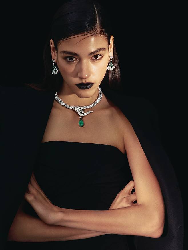 총 2.13캐럿의 페어·라운드 컷 에메랄드 6개와 총 3.93캐럿의 다이아몬드를 파베 세팅한 디바스 드림 화이트 골드 이어링, 페어 컷 에메랄드(총 0.34캐럿) 눈과 다이아몬드(총 39.55캐럿)를 세팅한 몸을 지닌 아이코닉한 뱀 모티브에 16.58캐럿의 페어 컷 콜롬비아산 에메랄드를 장식한 세르펜티 네크리스 모두 Bulgari.