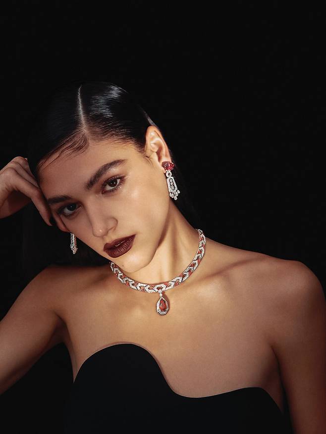 각각 7.52캐럿과 7.27캐럿의 오벌 브릴리언트 스텝 컷 타지키스탄산 스피넬 아래 페어 브릴리언트·라운드 브릴리언트 컷 등 다이아몬드를 파베 세팅한 라인이 우아하게 떨어지는 화이트 골드 이어링, 중앙에서 빛을 발하는 7.02캐럿의 페어 브릴리언트 컷 모잠비크산 루비 1개와 버프 톱 루비 64개(총 7.40캐럿), 스텝 컷 다이아몬드 124개(총 10.57캐럿), 다이아몬드 총 4.44캐럿을 정교하게 세팅한 플래티넘 네크리스 모두 Bulgari.