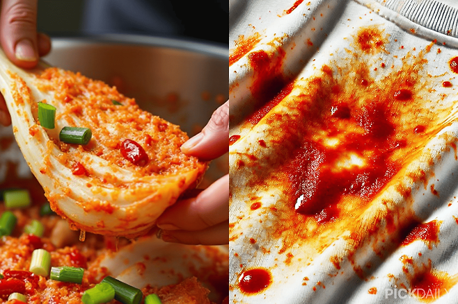 맛있게 김치를 담다 보면 옷에 김치 양념이 튀는 일도 종종 발생하곤 하는데요.