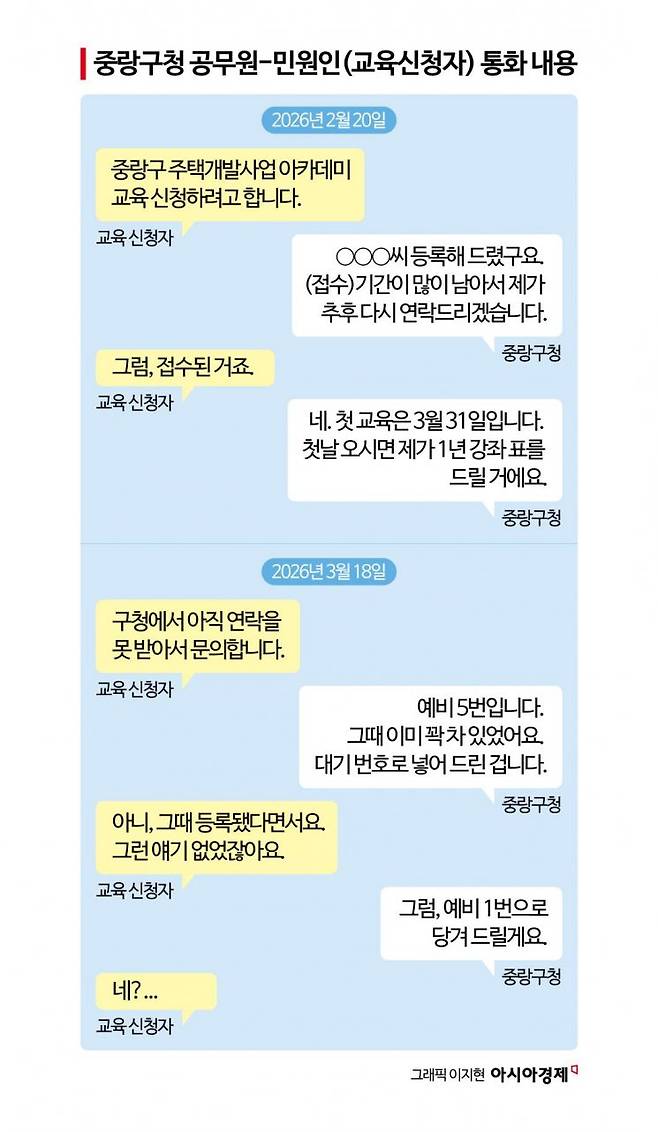 '선착순 신청'이라고 했지만, 신청 날짜조차 제대로 밝히지 못했고, 이보다 늦게 신청하고도 교육 대상자로 선정된 사례도 확인됐다. 한 주민은 “지난달 초 교육 대상을 확정한 ‘제9기 중랑부동산최고경영자과정’ 역시 모집·선발 과정이 불투명하기는 마찬가지였다”고도 했다.
